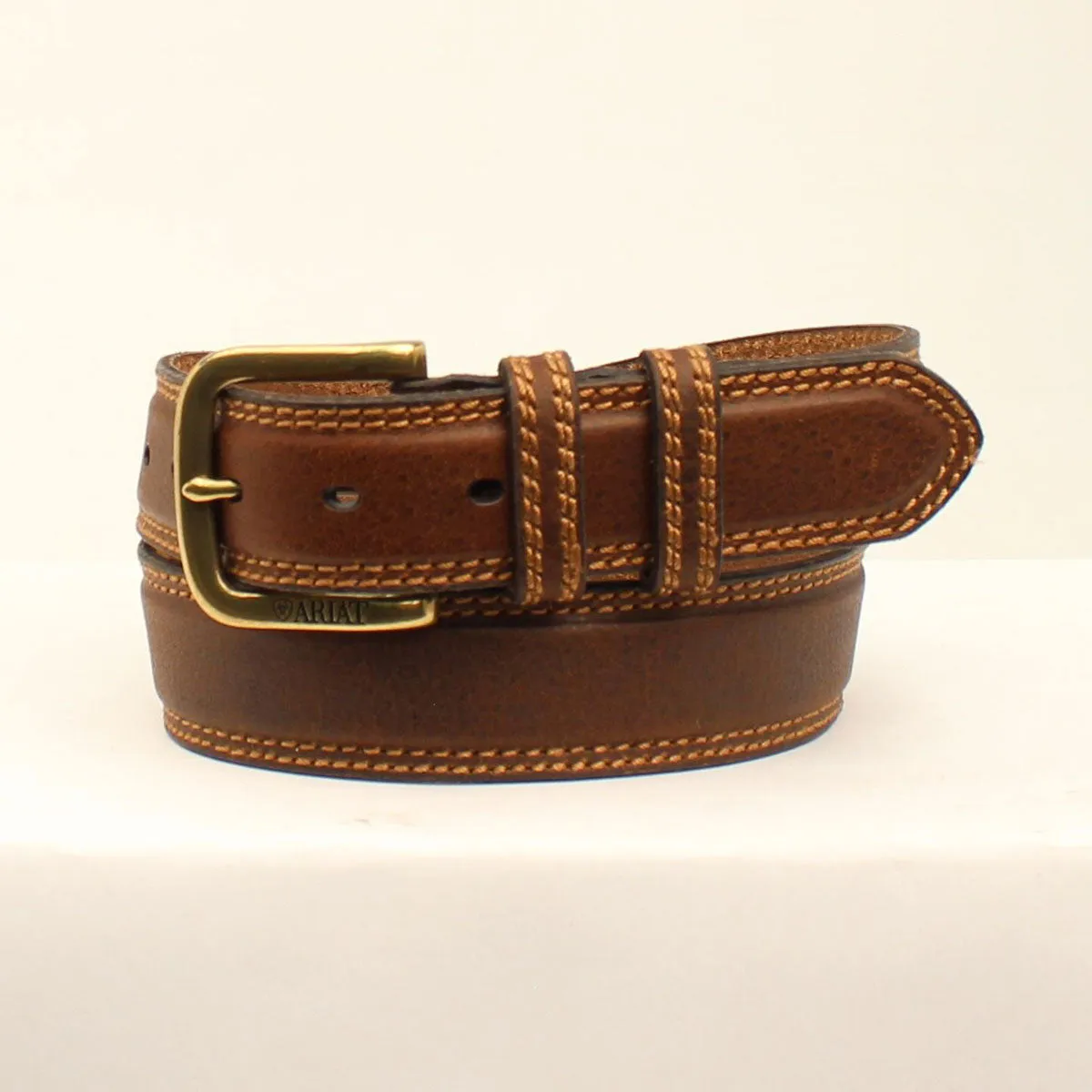 This mens Ariat belt by M&F Western Products has a classic look! It has a classic brown strap with double keepers and a brass buckle. This quality belt looks great and is designed for any occasion.