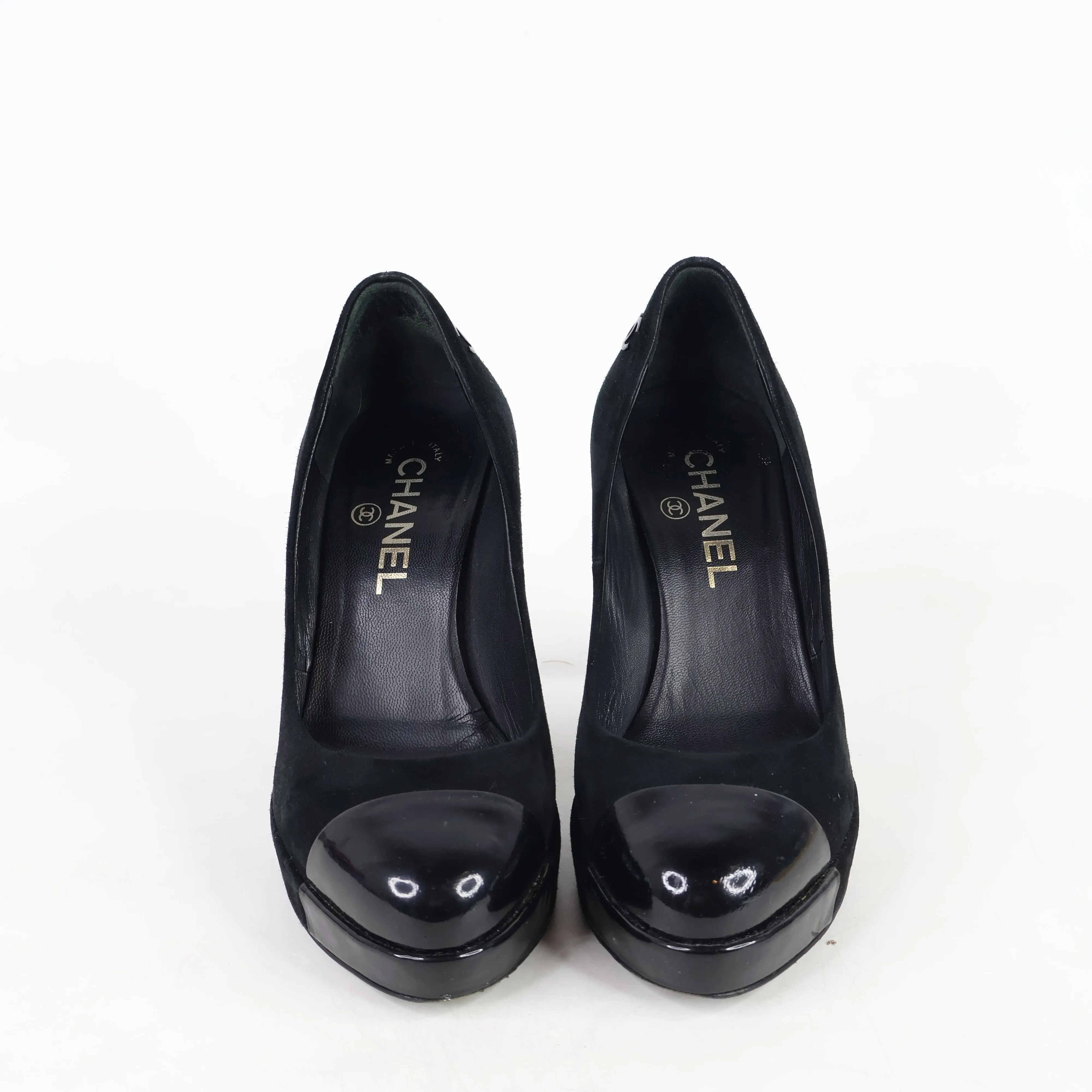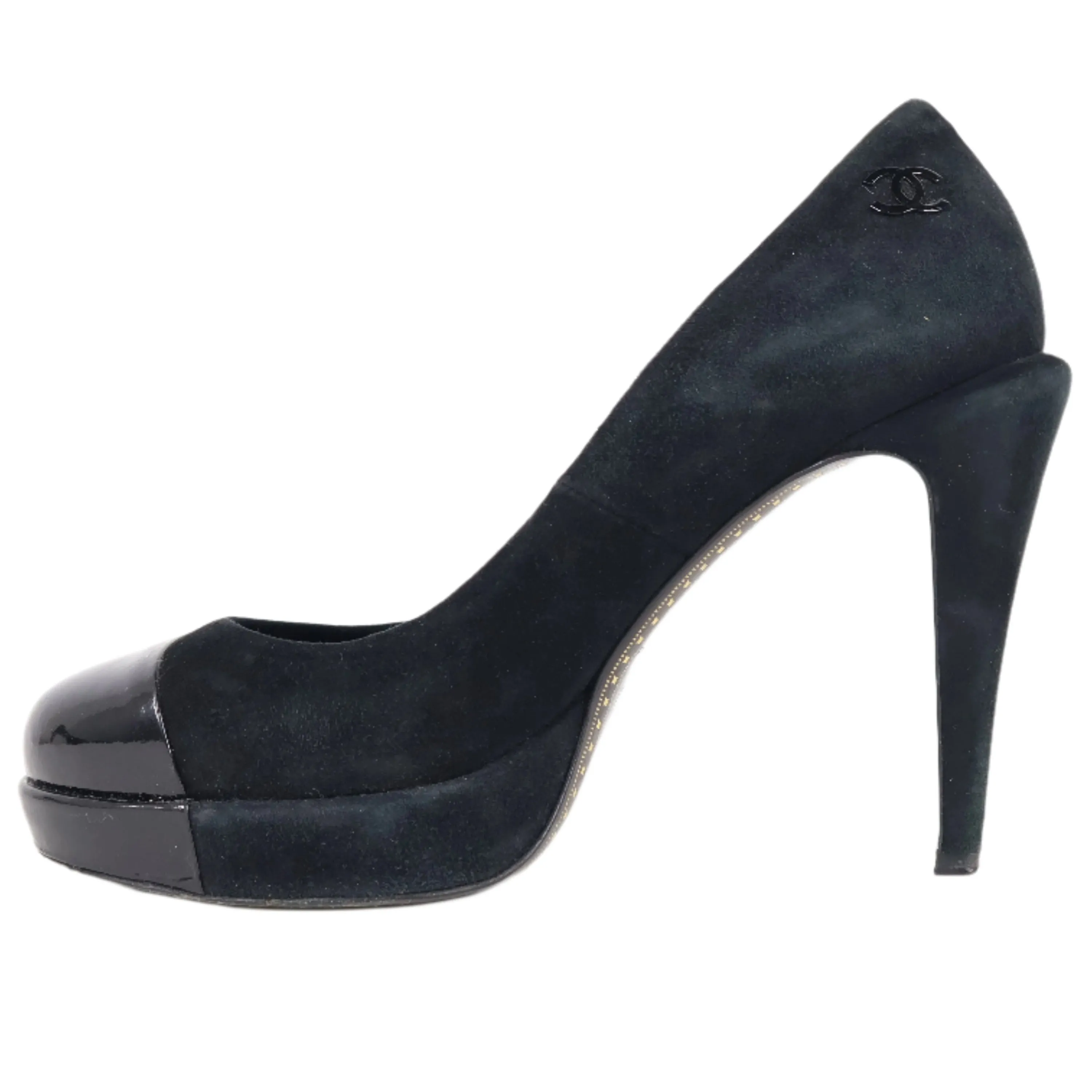 Elevate any outfit with these timeless Chanel pumps. Made with high-quality black suede and patent leather, these pumps provide both elegance and comfort. The perfect addition to any wardrobe, these shoes are sure to make a statement and elevate your style.