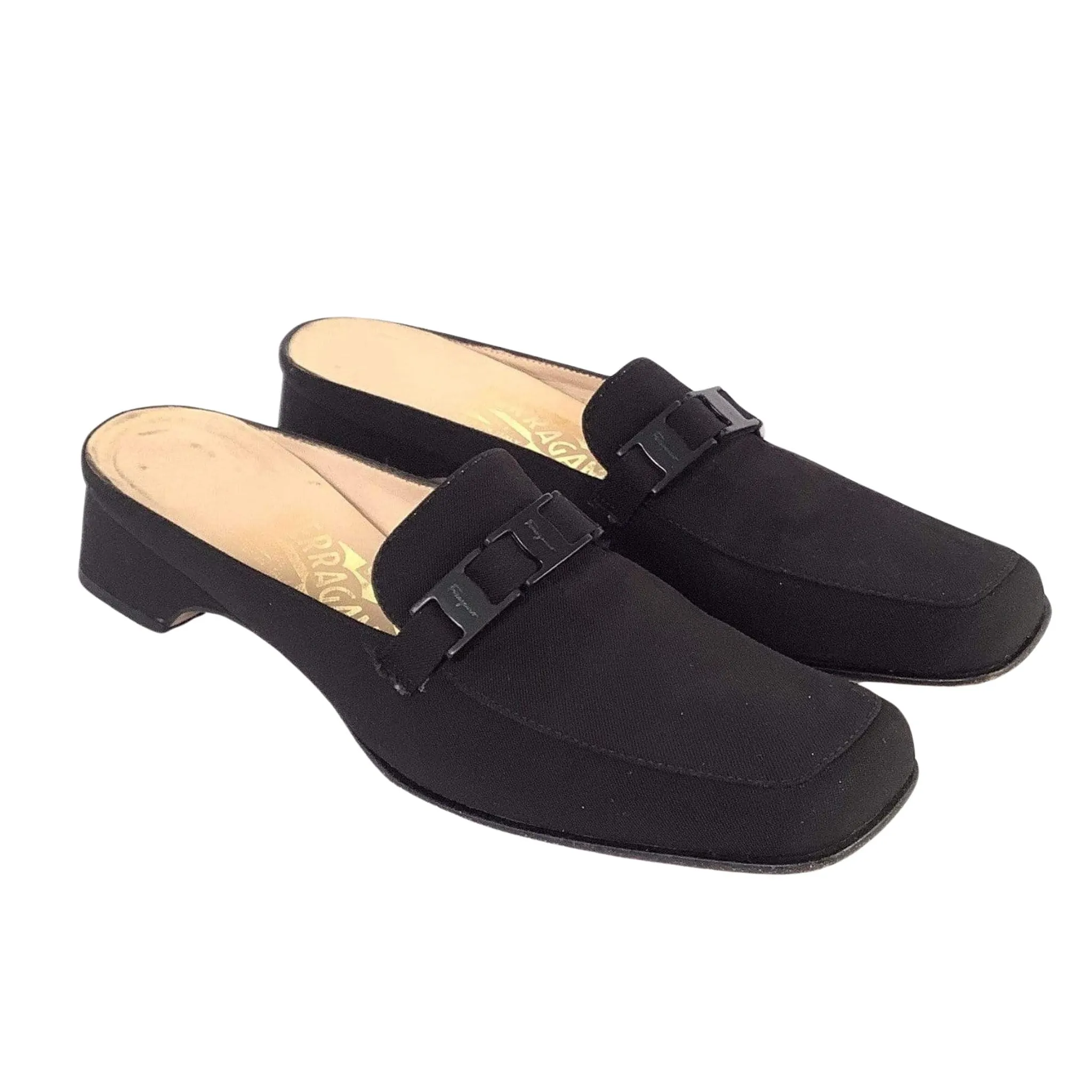 Salvatore Ferragamo low-heeled mules in women's size 7.5, pre-owned condition with visible signs of wear, featuring a classic design, square toe, black fabric upper, and leather sole, these daily wear shoes are perfect for any occasion, the square toe gives these shoes an air of sophistication. These Ferragamo Low Heel Mules in a slip-on, open-back style, stylish loafers made in Italy.