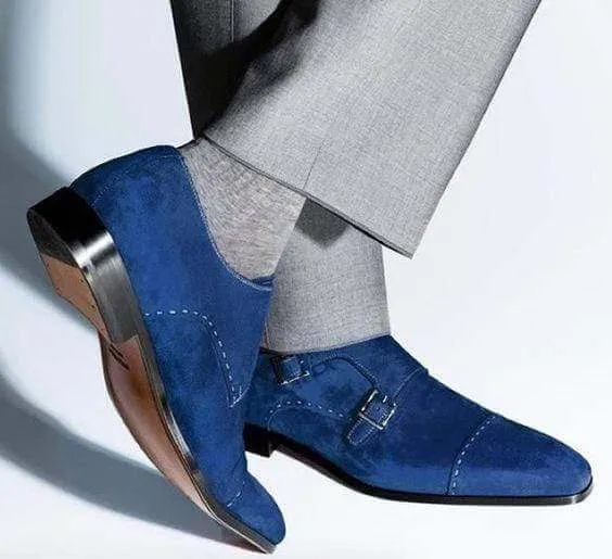 Handmade Men’s Suede Double Monk Shoes, Men’s Blue Color Strap Cap Toe Shoes
