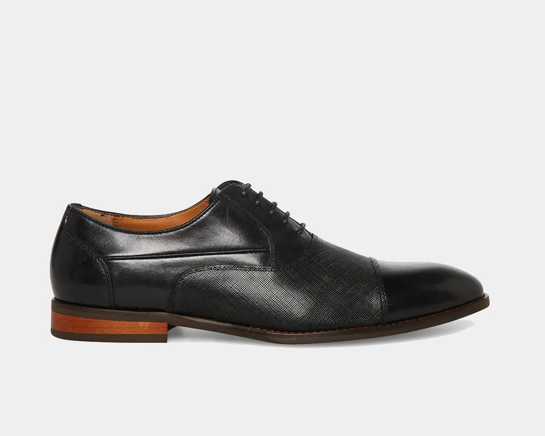 The Steve Madden Proctor oxford is not your typical dress shoes. Stand out from the rest of the crowd with this leather lace-up featuring a smooth cap toe and contrast stacked heels.