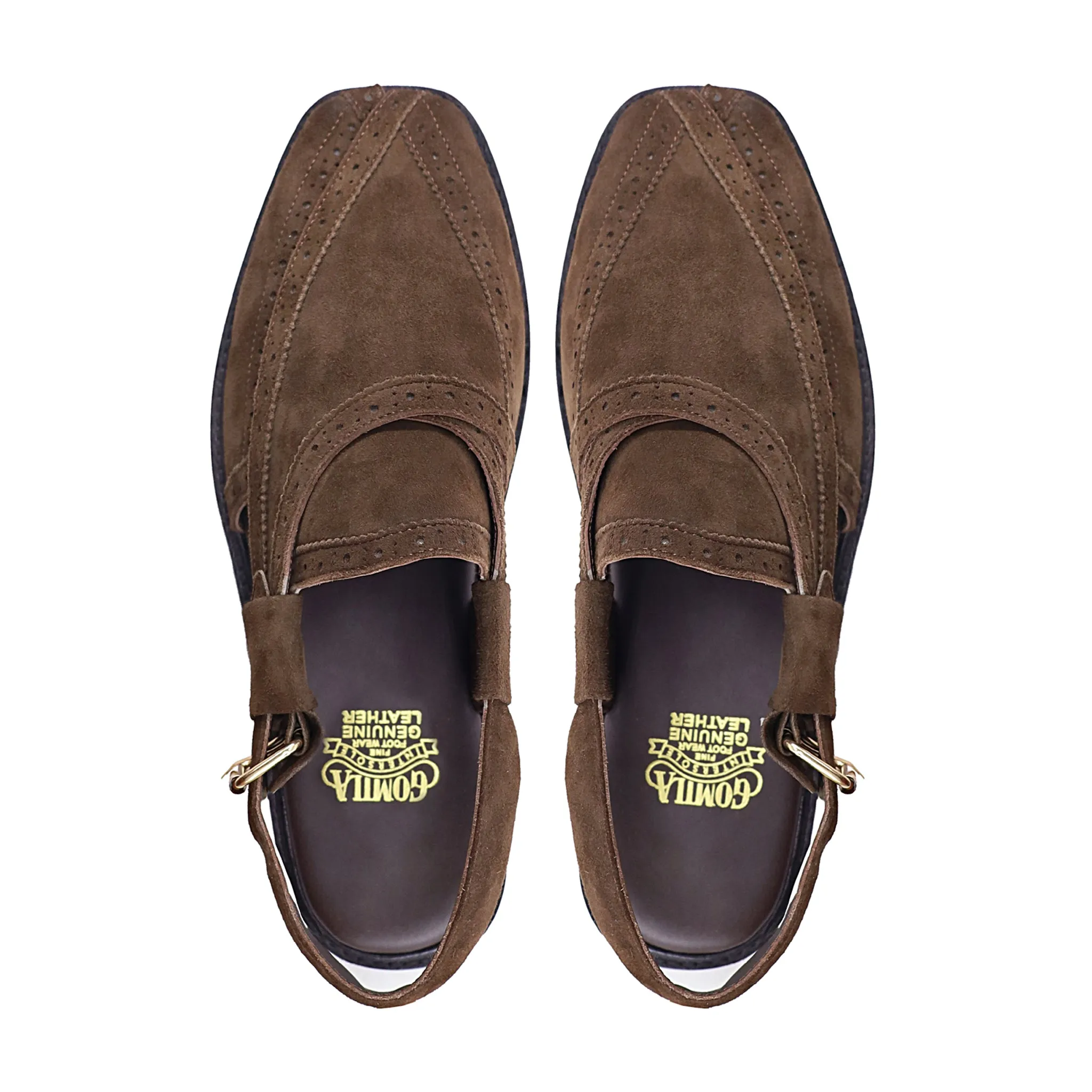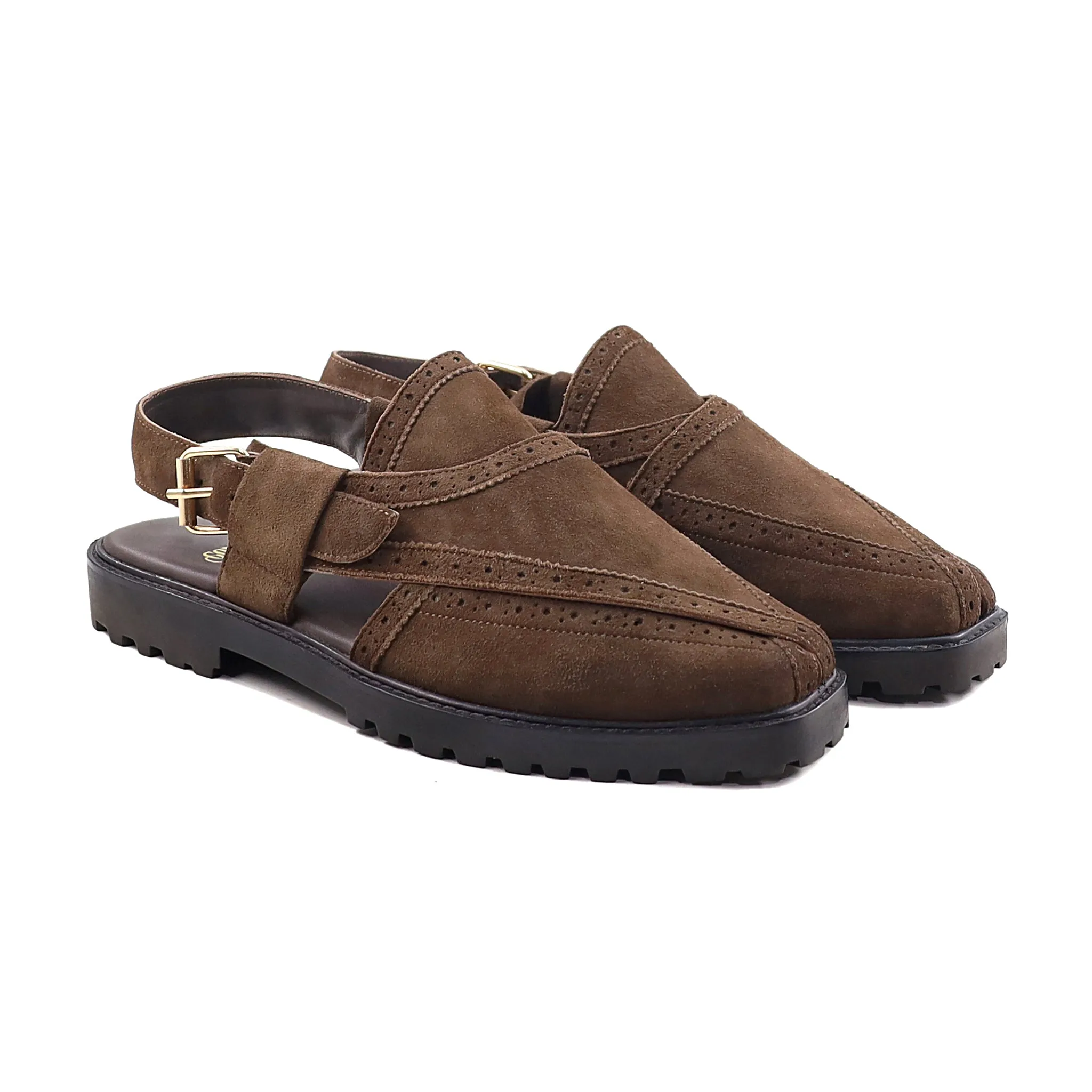 Swayn - Men's Brown Kid Suede Sandal with a commando sole in black color offers a sleek and refined option for both formal and casual occasions. The kid suede leather provides durability and a polished appearance. The commando sole ensures comfort and support with every step. Whether paired with tailored trousers or a summer dress, these sandals would add a touch of sophistication to any outfit.
