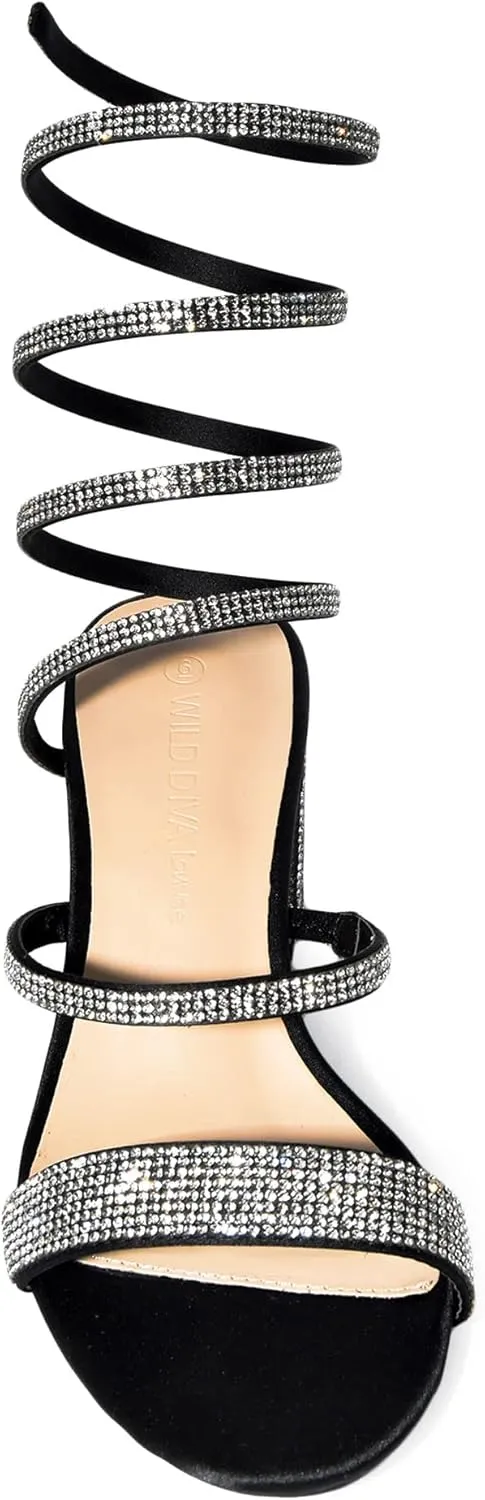 A pair of Wild Diva statement heels that feature an embellished rhinestone detail, satin finish, strappy design, almond open toe, low chunky block heel and has a sexy spiral ankle strap.